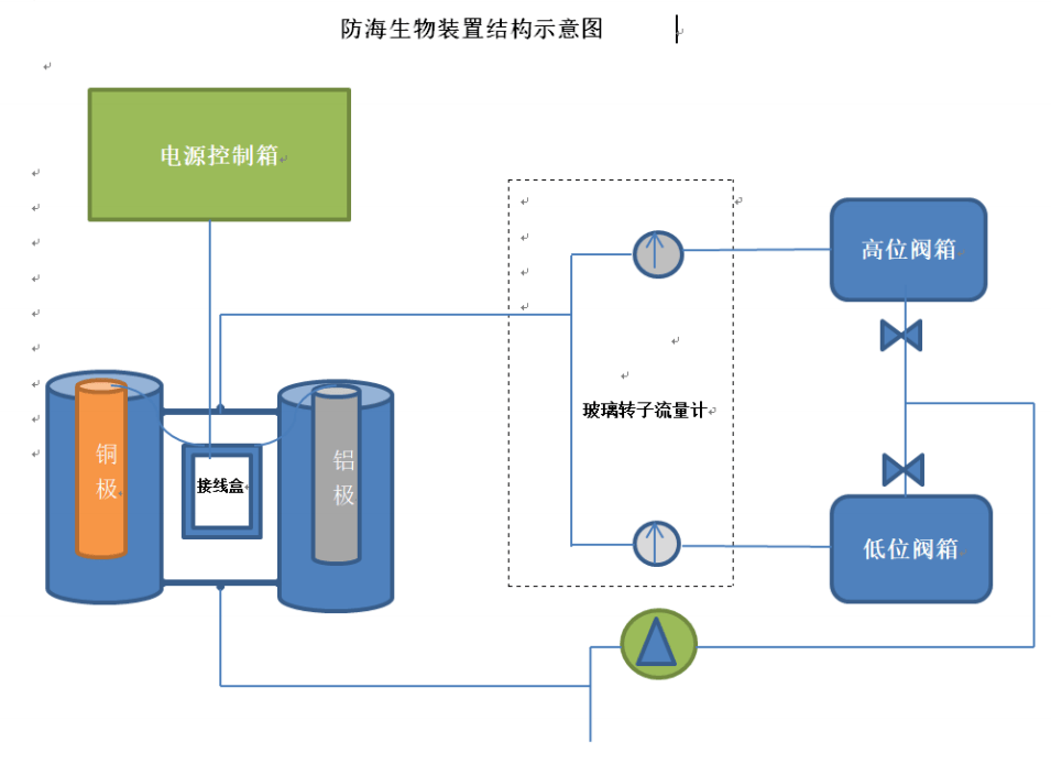 其基本结构组成为:恒流电解电源控制箱、防海生物阳极、防腐蚀阳极、电极筒、玻璃转子流量计(见图-2)。