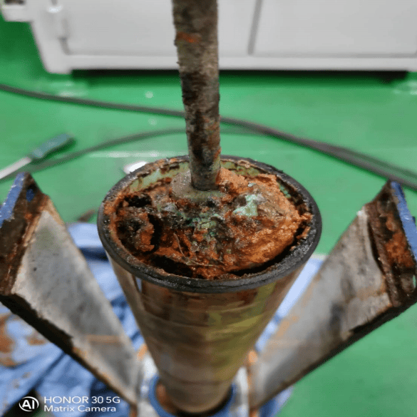 了解了整个系统构造后立即对系统进行全面的检查。恒流控制箱的控制界面显示,两个电极中铜极消耗剩余 92%,铝极消耗剩余 75%,电流也处于正常状态,查看控制系统没有任何的警报,系统完全处于正常状态。检查维保记录,上次电极筒铝极更换时间是五个月前,而铜极更换时间不到一个月,按理说两个电极均在使用寿命期内。为了验证控制界面的显示值是否和电极的实际消耗一致,对两个电极筒进行拆检,证实铜极和铝极的剩余量和控制界面显示值相差无几,筒内的电解残留物也并不多,上下两个考克能放出海水,说明电极筒内部及管路并没有堵塞的情况,也就是说海水在电极筒内的流动并不受影响。检查玻璃子流量计,两个流量计的浮球在最高处,即流量显示在最大位置。一切看起来都是正常的,但滤器的状态告诉我们问题肯定存在。于是选择对整个系统管路分段拆检,逐一排除,在拆检到玻璃转子流量计进口管时,发现放掉流量计里的海水时,玻璃管内浮球依然处在最高位,说明浮球是卡住了,拆出整个流量计,我们终于知道了为什么装置会失效,原来流量计的出口处几乎完全堵塞。拆检另一个流量计,情况基本一致。这意味着基本没有电解液进入到海水阀箱,导致海水系统无法得到有效保护。流量计堵塞情况(见图-3)。